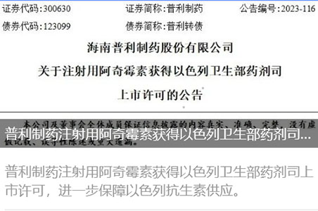 普利制药注射用阿奇霉素获得以色列卫生部药剂司上市许可