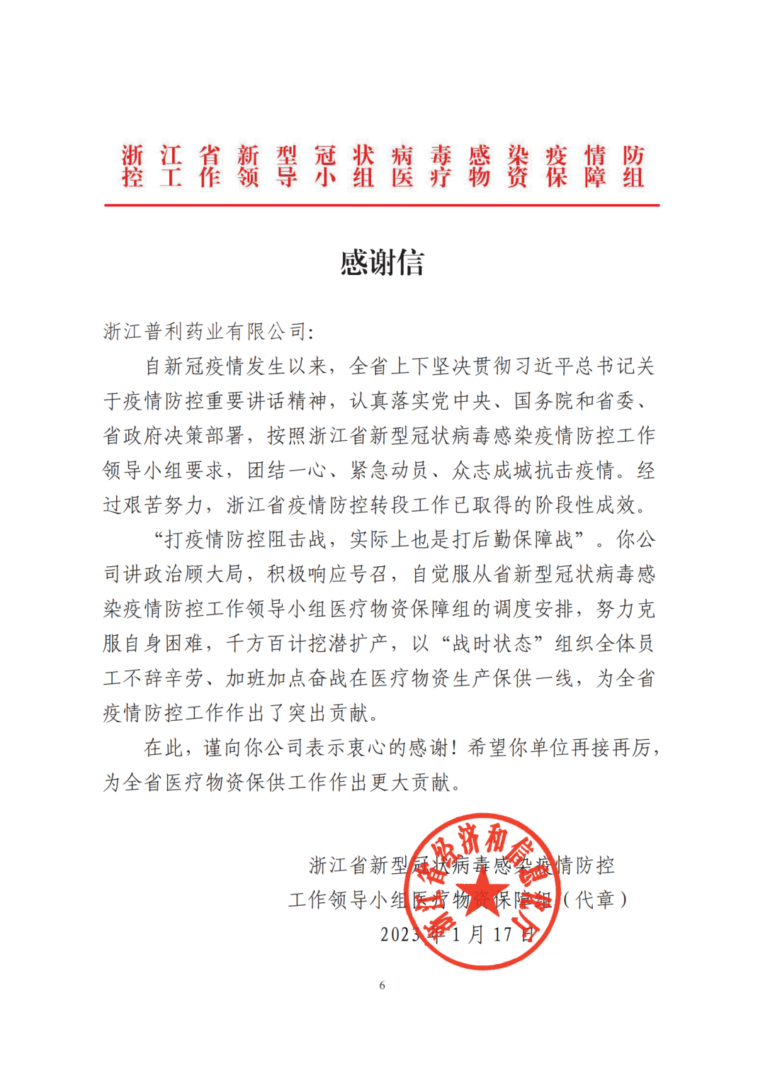 全力保供抗疫药品,浙江普利获省政府表扬!