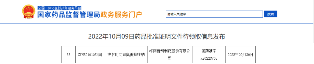 普利制药的注射用艾司奥美拉唑那成功研发后,分别递交美国、欧洲和中国的仿制药注册申请。2022年2月获得美国食品药品监督管理局(FDA)批准上市,2022年3月获得荷兰的上市许可。